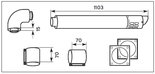 The set contains: - Horizontal wall / roof passage pipe with a diameter of 80/125 mm and a length of 1103 mm - cot 87 yards - two 70 mm long necklaces - Two wall rosettes with a diameter of 125 mm
